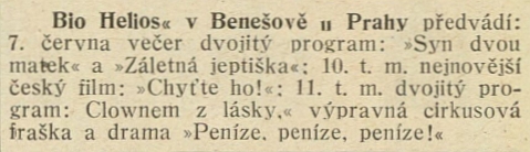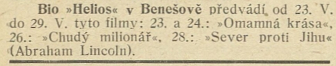 28.10.1925, kdy byl zahájen provoz v nově vystavěném „kamenném“ biografu. Můžeme se zde tedy např. ve vydání číslo 21 z 22. 5. 1925 dočíst, že „Bio Helios“ promítá v oněch dnech filmy „Omamná krása“, „Chudý milionář“ a „Sever proti Jihu“. V čísle 23 ze dne 5. 6. 1925 čteme, že budou uvedeny snímky „Syn dvou matek“, „Záletná jeptiška“, „Chyťte ho“, „Clownem z lásky“ a „Peníze, peníze, peníze!“