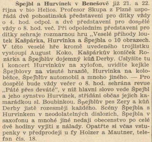 10. 1930 s tím, že v Bio Helios v obou dnech mají proběhnout dvě představení pro děti (od 16 hodin) a dvě pro dospělé (od 20 hodin). Pan Spejbl je zde psán ještě dobově s háčkem nad S, dětská verze se nazývala „Veselé příhody Kašpárka, Hurvínka a Špejbla o 10 obrazech“, zatímco revue pro dospělé nesla název „Páté přes deváté“. Připomeňme, že Hurvínek „se zrodil“ až v r. 1926, zatímco Spejbl existoval už od r. 1920, odkdy účinkoval spolu s Kašpárkem, kterýžto stál už na samém počátku „S+H“ coby již dlouholetá legendární postavička českého loutkářství.