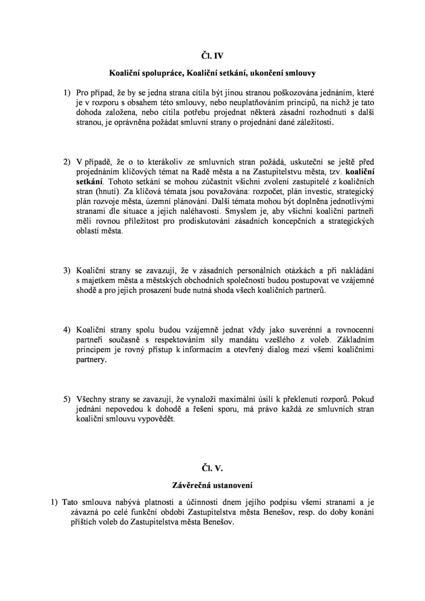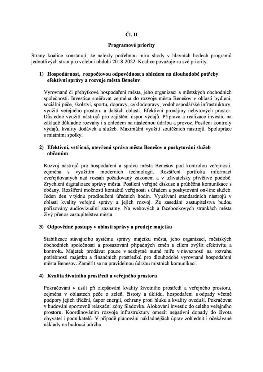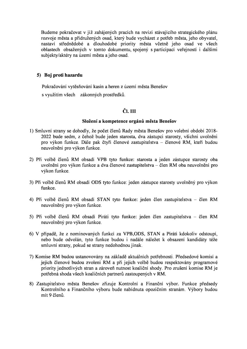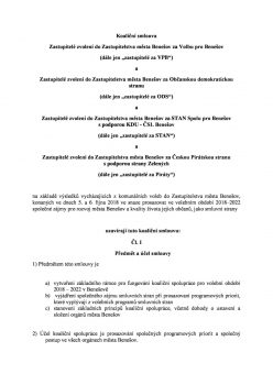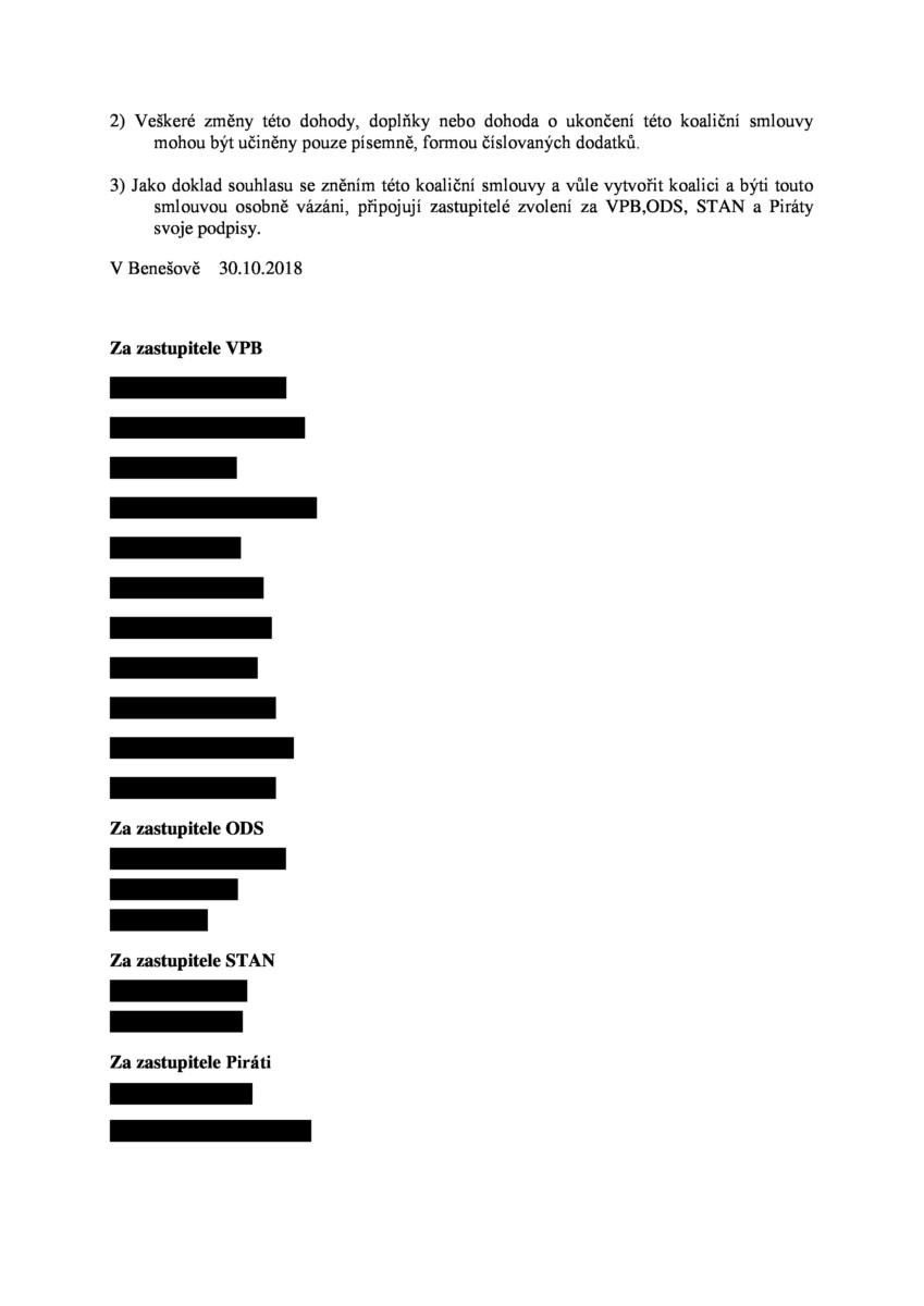 V úterý 30.10.2018 byla podepsána “koaliční smlouva” mezi čtyřmi subjekty, kterými jsou Volba pro Benešov, ODS, STAN a Piráti, tedy mezi volebními uskupeními, která byla poslední tři roky buď v opozici nebo jde o nové uskupení (Piráti).