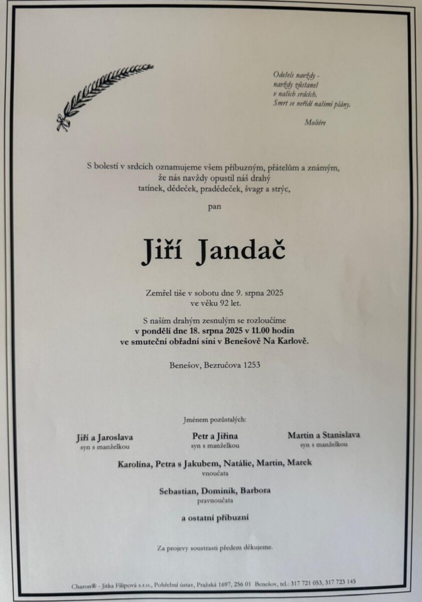 V sobotu 9. srpna 2025 opustil tento svět pan Jiří Jandač, člověk s bohatým životním příběhem, významný benešovský občan a bývalý dlouholetý místostarosta města.